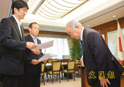 ■久間章生向前來抗議的長崎市市長致歉。 美聯社