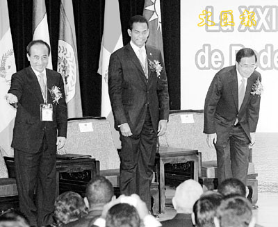 陳水扁今天上午出席在台北圓山大飯店舉行的第22屆「中美洲暨加勒比海盆地國會議長論壇會議」,致詞到尾聲時突然脫稿說,「在場的中美洲暨加勒比海國家的國會議長及議員們,都有機會及強烈意願進軍貴國的總統府,包括台灣的『立法院長』在內」。他祝福所有的議長及議員們,包括王金平「進軍總統府心想事成」。