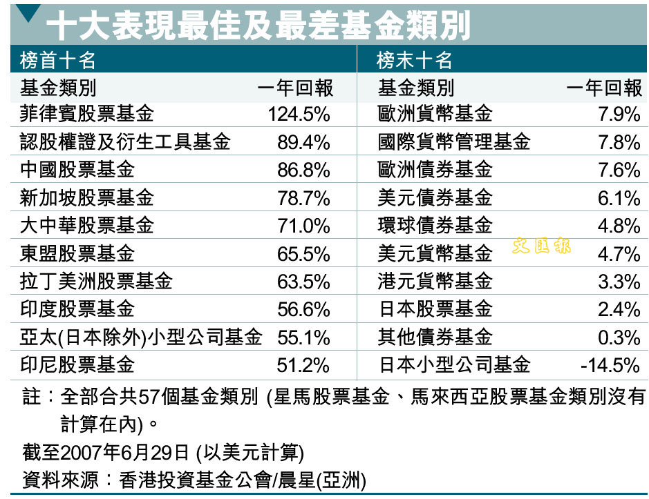 十大表現最佳及最差基金類別 (2007-07-06) (圖)