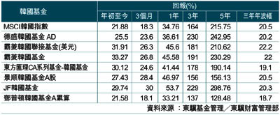 韓國於今年有股神畢菲特買入全球第三大鋼鐵公司—韓國POSCO 349萬股的消息刺激過後,韓國股市再度活躍起來,除了因為資金追落後的股市炒作外,更重要的是韓國的外貿及政治上有好消息出台。美韓在今年6月30日已簽署自由貿易協定,貿易加上政治前景改觀,韓國基金值得收集。 ■東驥基金管理部