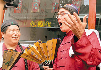 東西交流—在北京王府井小吃一條街,一名老外在展示剛學的「吆喝」技藝。