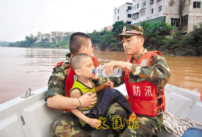 ■7日,在四川渠縣青龍鄉,武警官兵成功營救一名落入洪水的孩子。新華社