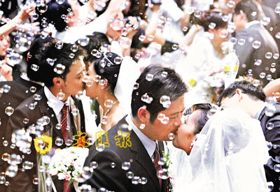 郝龍斌今天在市府一樓沈葆禎廳主持集團結婚,現場並有73對新人參加,加上前來祝福的親友,把市府擠得水泄不通,郝龍斌在主持儀式時,還要新人擁吻99秒,象徵長長久久,加上主辦單位精心設計滿天都是肥皂泡泡的場景,氣氛相當溫馨。