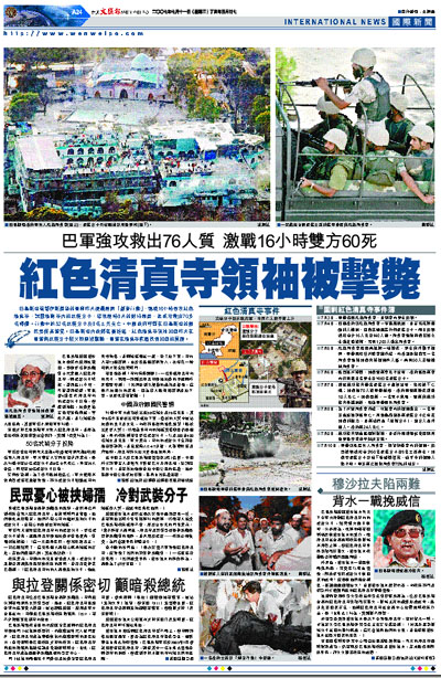 巴基斯坦首都伊斯蘭堡的軍隊昨天凌晨展開「靜音行動」,連續16小時強攻紅色清真寺,試圖清剿寺內的武裝分子,結束歷時8天的對峙局面,並成功救出70多名婦孺。行動中約52名武裝分子及8名士兵死亡。中國政府呼籲在巴基斯坦的國民要提高警覺。巴基斯坦內政部官員透露,紅色清真寺領袖加齊昨天在軍警與武裝分子駁火期間被擊斃,軍警在清真寺底層找到加齊的屍體。