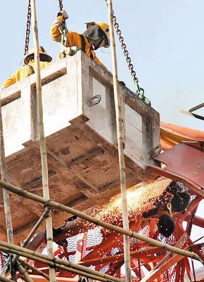 ■消防員乘坐吊船鋸斷鐵架拯救被困工人。本報記者劉國權 攝