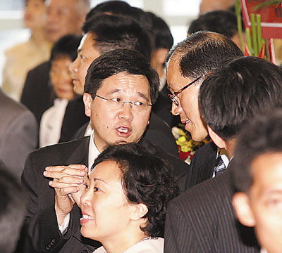 話說大會司儀在祝酒儀式前,逐一邀請各局長到台上各就各位,豈料曾局長竟然被遺漏了,只好乖乖留守眾嘉賓之中。可幸新班子果然有「團隊精神」:運輸及房屋局局長鄭汝樺及發展局局長林鄭月娥發現人海中的曾德成,即向司儀「提水」,再邀請曾局長上台。