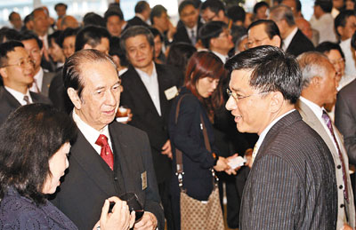 ■何鴻燊跟「官場新丁」陳家強交談。本報記者劉國權 攝