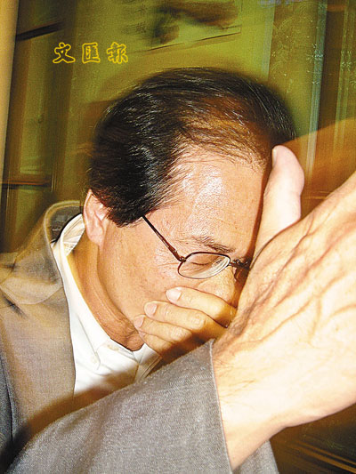 ■廣播處長朱培慶全程避在女伴背後,或用手掩臉以防被拍攝到。 資料圖片