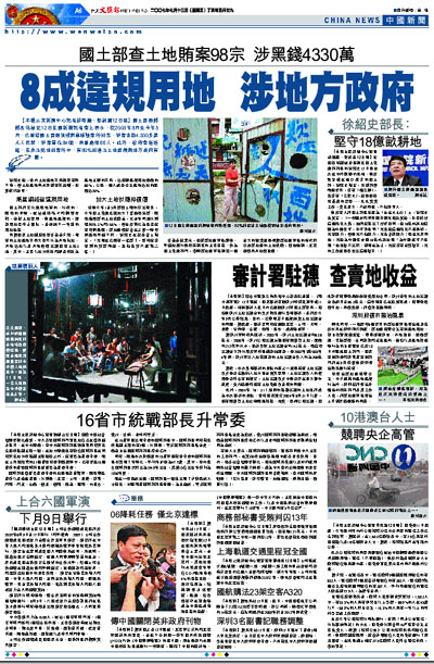【本報北京新聞中心記者胡海巖、彭凱雷12日電】國土資源部部長徐紹史12日在國新辦記者會上表示,從2005年8月至今年5月,已查結國土資源領域商業賄賂案件98宗,涉案金額4,330多萬元人民幣,涉案單位84個,刑事處理66人。此外,發佈會還透露,在非法批地的案件中,有80%的違法土地面積與地方政府有關。