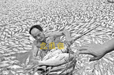 11日,武漢東湖風光村附近官橋湖水域再現「翻塘」。湖面上白花花的一片,大片死鰱魚已覆蓋了近岸水面。8艘漁船游弋在湖心處,打撈死魚,惡臭熏得路人掩鼻而過。據武漢市東湖風景區環保分局負責人介紹,由於湖水污染加上天氣炎熱,造成了此次10萬斤的死魚。此處由於負營養化嚴重,已禁止附近村民養魚,但屢禁不止。