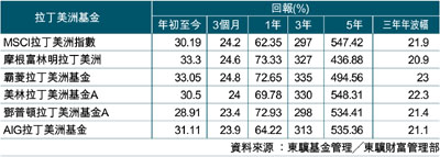 另外,霸菱拉丁美洲基金較看好巴西及墨西哥的消費股,並維持持有偏高的比重。此基金獲標準普爾三星評級,過往一年的回報亦達72.65%,優於指數的62.35%。