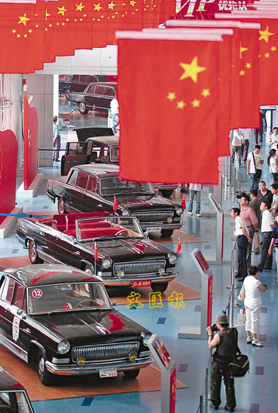 第五屆中國長春國際汽車博覽會昨在吉林長春國際會展中心開幕,在中國及海外市場佔有一定市場份額的99家乘用車及商用車生產企業參展。圖為觀眾在觀看參加展出的老式紅旗車。 新華社