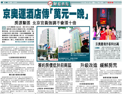 2008年奧運會日益迫近,預計明年8月奧運會期間大約有265萬國內外客人來京觀看比賽或旅遊,其中有50多萬為國外觀眾,在京「宿」在何處成為眾人關注熱點。日前有媒體報道稱,奧運會期間北京酒店價格會上漲十倍,有五星級酒店標出每晚一萬多的高價,且必須多日連續入住。而被媒體指有「萬元」高價的酒店稱,萬元高價純係謠言。