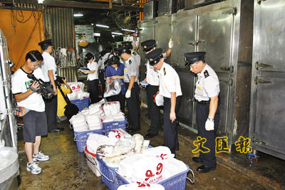 ■食環署人員在非法肉工場內檢走大批肉丸。