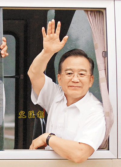 ■溫家寶總理向災區群眾揮手致意。 本報安徽傳真