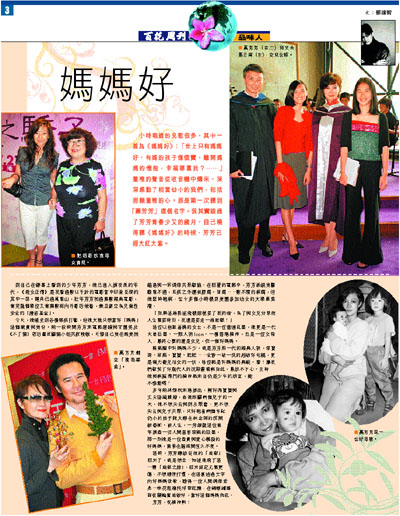 娛樂圈中好媽媽不少,就是芳芳那一代的經典人物,像寶珠、家燕、寶寶、肥肥……全皆一級一流的超級好母親,更是獨力養兒活女的一伙,每位都是好媽媽的典範。看!讓我們歡笑了好幾代人的沈殿霞重病如此,最放不下心、支持她與病魔搏鬥的精神都來自仍是少年的欣宜,能不感動嗎?