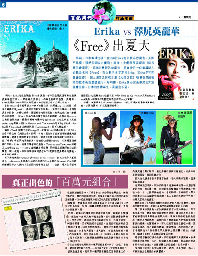 聽到《Free》副歌之後的bridge位,有幾句Erika唱得出奇地「有力」,完全不像之前《太陽之歌》的弱,可能,是她為了要更受歌迷愛戴而苦練歌喉,變得音域與混聲皆有進步。筆者亦驚嘆日本樂壇對如何塑造一位「歌手」時必需的準繩計算。隨首批CD附送的DVD,可算是這塊甜餅的內餡。Erika一身重型懷舊味的裝扮,又smokey eyes又one piece短裙又punk味bra top…… MTV 盡視聽享受至極,同時滿足到她所有粉絲的需要。唯一就是,不明白導演為何要在MTV裡放那麼多寫水的慢鏡,很奇怪的感覺。