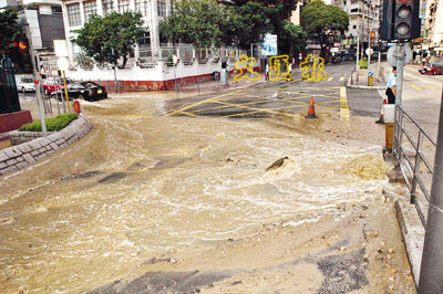 油麻地佐敦道與覺士道交界一條地底鹹水管,昨清晨6時許突然爆裂,大量鹹水沖毀路面淹浸多條行車線(見上圖),警員到場封閉受影響路面,同時知會水務署人員到來關水掣及搶修;由於封路關係,加士居道交通一度嚴重擠塞,所有車輛須繞道而行。