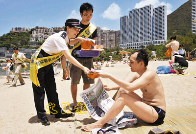 ■警方到淺水灣派發宣傳紀念品及滅罪單張,呼籲小心「沙灘老鼠」。 本報記者梁祖彝 攝