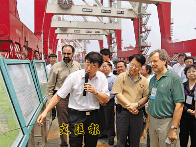 ■遼寧第二大港——營口港黨組書記李松向商務人士考察團成員介紹營口港目前發展狀況。