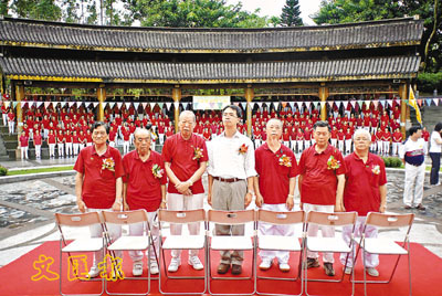 ■北區民政專員黃宗殷(中)、文仁會長、李江海主席等與近千名長者面向國旗肅立。