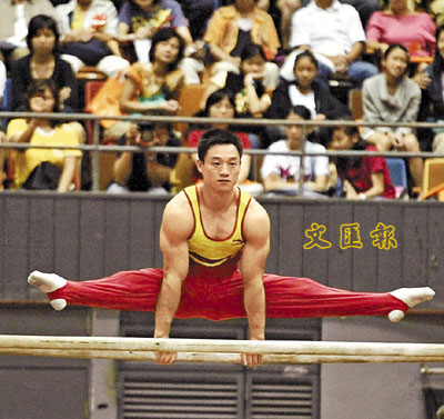 中國體操隊員楊威昨日在紅磡體育館的「體操精英大匯演」中表演雙槓項目,完美的動作、氣定神閒的表情及穩當的落地讓觀眾掌聲不斷。 本報記者郭思華 攝