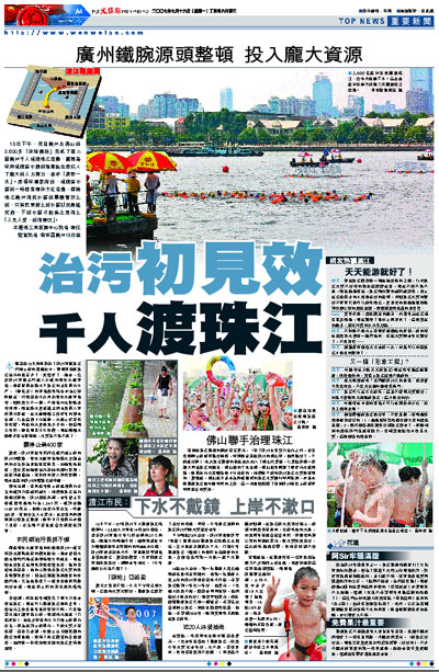 15日下午,來自廣州及佛山的3,600多「泳壇健將」完成了第二屆廣州千人橫渡珠江活動,當局為保障橫渡區水體的清潔衛生而投入了龐大的人力物力,務求「萬無一失」。而環保專家指出,橫渡區水質的一時適宜暢泳不足自喜,整條珠江廣州河段水質的關鍵繫於上游,只有民眾對上游水質狀況展露笑顏,下游水質才能真正算得上「人見人愛,游得暢快」。