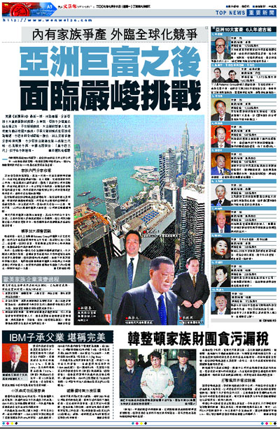 美國《新聞周刊》最新一期,刊登專題,分析亞洲十大富豪面臨的挑戰。文章說,亞洲不少首富已臻古稀之年,子女紛紛接班,大企業的話事人在未來數年勢必來個大換班。子承父業的模式在亞洲極為普遍,不過目前全球經濟一體化,加上兄弟爭產分家時有所聞,不少亞洲企業傳至第二或第三代時,已是風光不再,中國古語有云︰「富不過三代」,似乎也不無道理。