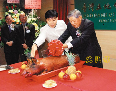 ■台灣土地銀行在香港辦事處升格分行,典禮儀式入鄉隨俗,拜神切燒豬。