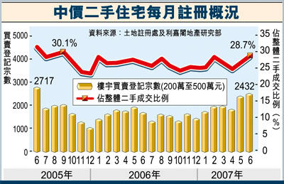 他解釋,本港經過97年金融風暴後,中產階級受傷程度最深,除了飽受負資產困擾外,失業問題亦不斷纏繞,所以,價值介乎200至500萬元的中價二手物業交投向來稀疏,每月成交量甚少超越2,000宗水平。