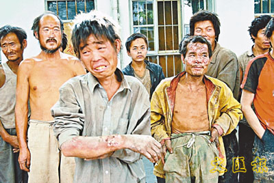 ■一群被解救出來的臨汾黑磚窯工人站在公安局前。資料圖片