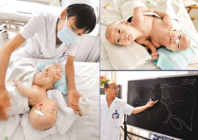 河北醫科大學第一附屬醫院將於近日為一對連體女嬰實施分體手術。據了解,這對連體姐妹出生於2007年3月15日,胸腹連接,並都患有先天性心臟病。上圖為這對連體姐妹。下圖為河北醫大一院的醫生在介紹為連體女嬰設計的分體手術方案。左圖為護士在給連體女嬰餵奶。 新華社