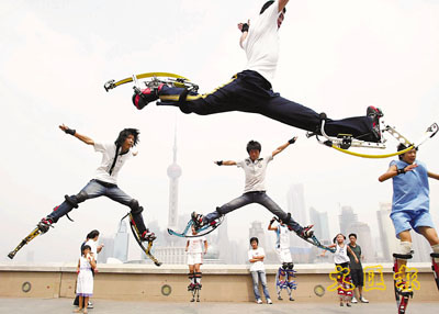 ■幾位年輕人在上海外灘腳蹬「彈跳高蹺」表演。這種彈跳器源於中國的高蹺,由德國人研製而成。新華社