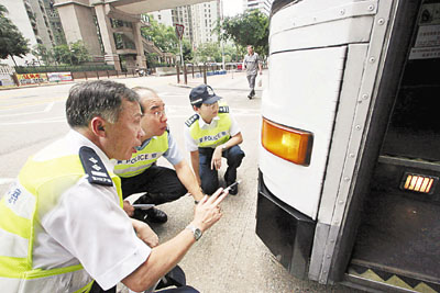 ■警員在車禍現場檢查肇事巴士的輕微損毀車頭。本報記者蔣焯文 攝