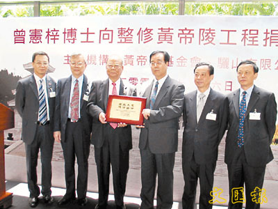 【本報訊】(記者 潘曉平)黃帝陵基金會、驪山有限公司昨天假香港君悅酒店隆重舉行曾憲梓博士向黃帝陵整修工程捐資公告會。全國人大常委、金利來集團主席曾憲梓和兒子曾智雄於儀式上,向黃帝陵基金會遞交了100萬元捐款支票。黃帝陵基金會理事長孫天義,副理事長強文祥、宋祖華等向曾憲梓父子頒贈了榮譽證書和珍貴紀念品。中聯辦秘書長趙廣廷、宣傳文體部蔡文中副部長及港澳各界知名人士出席捐贈儀式。