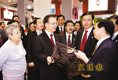 ■溫家寶總理視察第100屆廣交會琶洲展館品牌綜合展區。在廣東絲綢紡織集團展位上,廣東絲綢紡織集團董事長蔡高聲向溫家寶總理匯報生產經營情況。