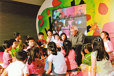 ■「名人講故事」拉近名人與小朋友之間距離,反應熱烈。圖為06年靳埭強在香港書展「兒童天地」為小朋友講故事。