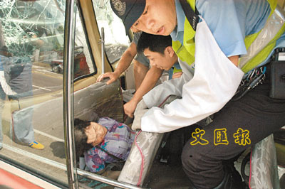 ■小巴尾座一名老婦被座椅所夾,受傷昏迷,警員合力板開座椅施救。