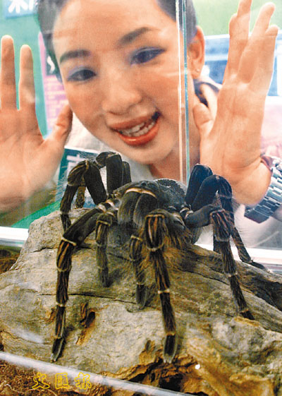 東港城於明日舉行全亞洲最大型室內爬蟲及兩棲動物展,展出101種逾1,000頭爬蟲及兩棲動物,當中包括四頭「四大美蜥」,紅瘰蠑螈、黑眉錦蛇及十二角地龜等珍貴爬蟲動物。圖為亞馬遜食鳥蜘蛛。本報記者 潘政祁 攝