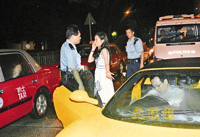 ■一輛法拉利跑車涉衝燈違例,男司機被捕,其妻(中)接報趕至找來友人將車駕走。