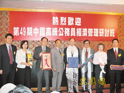 ■培華教育基金霍震寰主席(右四)、副主席王敏剛(右三 )、伍淑清(右二)等獲研討班團長儲成功等贈送紀念品。本報記者潘曉平 攝