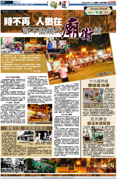 帶著攝影器材,走在下午6時的廟街。筆者有點不知如何是好,因為在小時曾聽過:「在品流複雜的廟街拿出相機會被人打。」結果,事實證明傳說始終是傳說。傳說雖成過去,卻不代表其沒有存在價值。