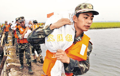 ■20日,安徽省武警總隊的數百名官兵繼續在焦崗湖穎上魯口段奮戰,打樁加固加高堤壩,積極預防可能發生的新險情。新華社