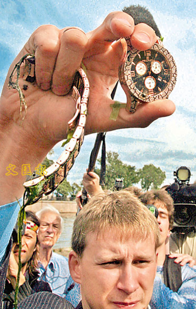 ■經過5天努力,俄羅斯蛙人協會終於成功打撈到這塊價值20萬美元的金表。 法新社