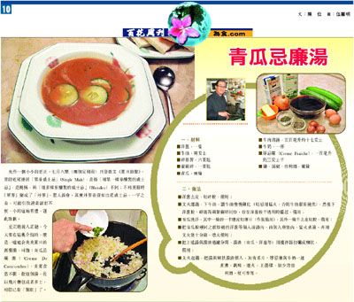更正過後入正題。今天要在這裡介紹的,還是一道適合炎炎夏日的西餐湯,叫做:青瓜忌廉湯(Creme De Concombre),炎夏食慾不振,飲這個湯,佐以幾片麵包或者多士,相信已是「飽肚」了。