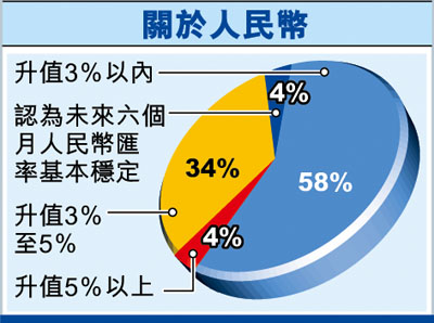 關於人民幣升值趨勢,多數經濟學家預期人民幣將保持溫和升值態勢,部分認為升值步伐可能會加快。調查顯示,4%的經濟學家認為未來六個月人民幣匯率(兌美元)將「基本穩定」,58%的經濟學家認為將「升值3%以內」,比一季度減少4個百分點;34%認為將「升值3%-5%」;還有4%認為將「升值5%以上」。