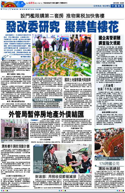 最新數據顯示,內地經濟多個領域依然過熱,存在流動性過剩、投資增長過快、外貿順差過大等問題。國家發改委宏觀經濟研究院經濟形勢分析課題組日前發表的一份報告,就對當前內地經濟的突出問題作出建議。對於內地樓價格持續快速攀升,建議出重手調控房地產市場,具體措施包括大幅加大稅收幅度、出台物業稅,取消預售房(港稱「樓花」)制度,同時對居民購買第二套以上住房採取抑制性的金融政策等。