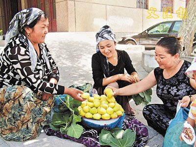 24日,新疆庫車縣伊西哈拉鎮托萬比加克村的阿依仙木正出售自家的無花果。2元錢三個的無花果成了人們爭相購買的水果之一。 中新社