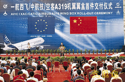 ■24日,首架中國製造的空客A319飛機機翼盒在西安交付,中國是空中客車在歐洲以外與之開展機翼合作項目的第一個國家。圖為交付現場。 中新社