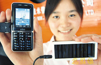 ■安徽亳州市一家高科技公司生產出一種太陽能充電器,這款太陽能手機充電器配備了多種型號的插孔,不同品牌的手機都可以使用。同時,除了能給手機充電外,還可以給MP3、MP4、數碼相機等多種移動數碼產品充電,使用起來非常方便。 中新社